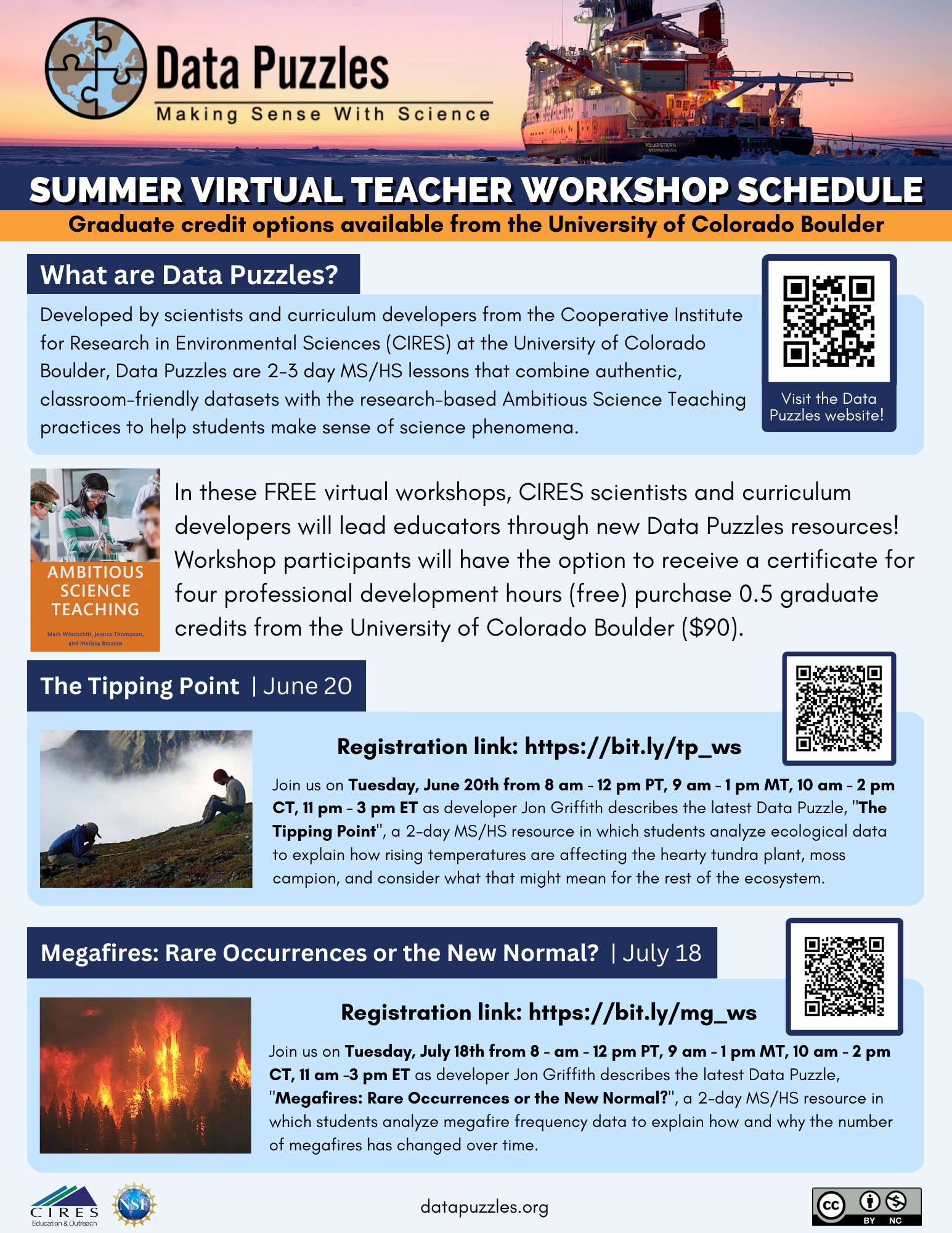 Data Puzzles are 2-3 day lessons that combine classroom-friendly datasets with Ambitious Science Teaching instructional practices to help students make sense of science phenomena. These two Data Puzzle workshops will be co-facilitated by my (the lead developer) and the scientist who is featured in the resource.